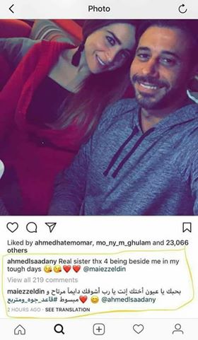 أثارت صورة قام مؤخرا للفنان أحمد السعدني، نشرها وهو برفقة الفنانة مي عزالدين، عبر موقع تبادل الصور الشهير "إنستجرام"، جدلا لمستخدمي مواقع التواصل الاجتماعي، حيث نشرها «السعدني»، معلقا عليها: "الأخت الحقيقة التي تقف بجانبي في الأوقات العصيبة"، وردت عليه الفنانة مي: "بحبك ياعيون أختك ويارب أشوف دايما فرحان ومبسوط".