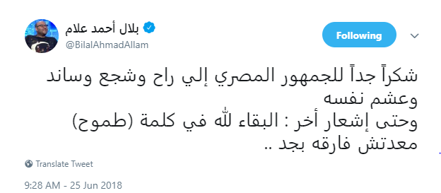 وقال بلال أحمد علام، الناقد الرياضي، «شكرا للجمهور المصري اللي راح وشجع وساند وعشم نفسه، البقاء لله في كلمة طموح».