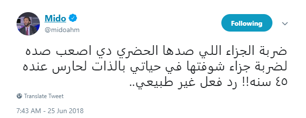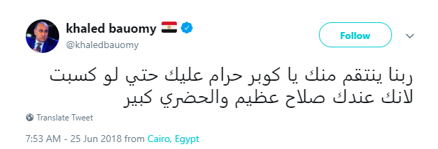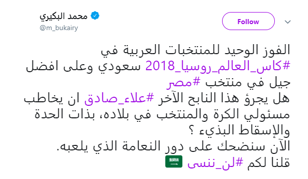 وقال محمد البكيري، رئيس تحرير صحيفتي (النادي والرياضي) سابقا، "الفوز الوحيد للمنتخبات العربية في كاس العالم روسيا 2018 سعودي، وعلى أفضل جيل في منتخب مصر".