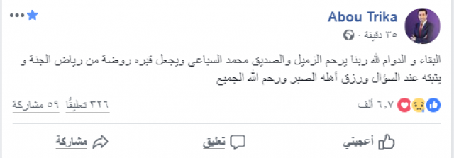 وكتب "أبوتريكة" عبر الصفحة الرسمية له على موقع التواصل الاجتماعي "فيس بوك" قائلا: "البقاء والدوام لله ربنا يرحم الزميل والصديق محمد السباعي ويجعل قبره روضة من رياض الجنة ويثبته عند السؤال ورزق أهله الصبر ورحم الله الجميع".