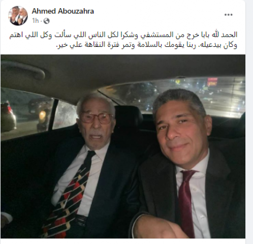 وكتب أبو زهرة على الصورة: "الحمد لله بابا خرج من المستشفى وشكرًا لكل الناس اللي سألت وكل اللي اهتم وكان بيدعيله، ربنا يقومك بالسلامة وتمر فترة النقاهة علي خير".