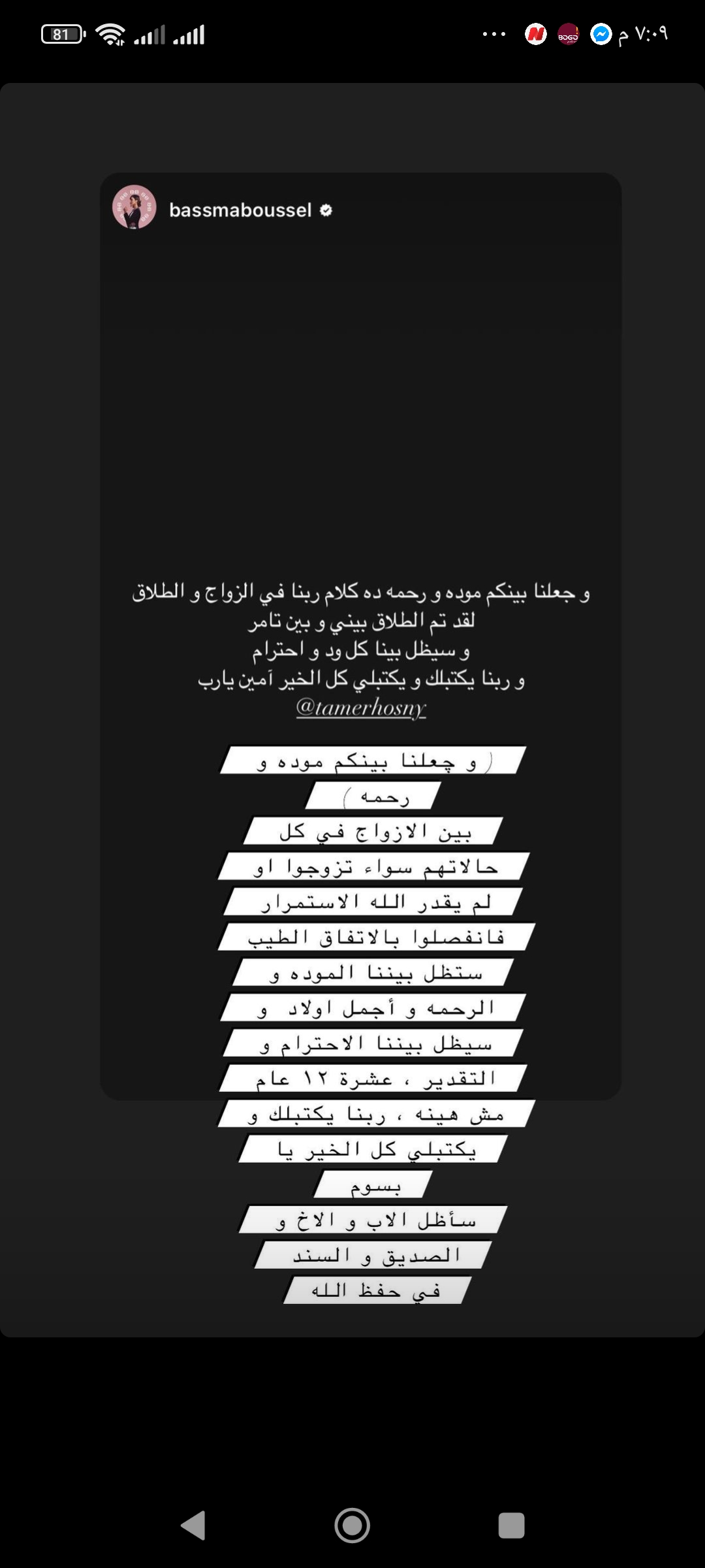 وكتبت بسمة بوسيل عبر خاصية الاستوري على انستجرام: وجعلنا بينكم مودة ورحمة.. ده كلام ربنا في الزواج والطلاق، لقد تم الطلاق بيني وبين تامر وسيظل بيننا كل ود واحترام.. ربنا يكتبلك ويكتبلي كل الخير.. آمين يارب.