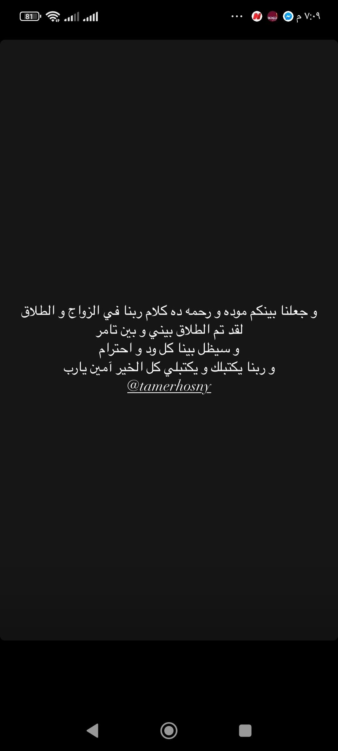 وكتب تامر حسني عبر خاصية الاستوري على انستجرام: "وجعل بينكم مودة ورحمة، بين الأزواج في كل حالاتهم سواء تزوجوا أو لم يقدر الله الاستمرار فانفصلوا بالاتفاق الطيب، ستظل بيننا المودة والرحمة وأجمل أولاد، وسيظل الاحترام والتقدير، عشرة 12 عام مش هينة، ربنا يكتبلك ويكتبلي كل الخير يا بسوم، سأظل الأب والأخ والصديق والسند، في حفظ الله".