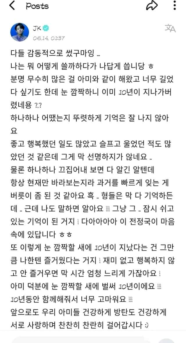 شكرا جزيلا لوجودك معنا لمدة 10سنين !!! دعنا نواصل السير معًا ببطئ وبشكل رائع ، مع الارميز وBTS بصحة جيدة ، ونحب بعضنا البعض .