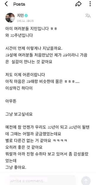 شارك النجم "بارك جيمين" جمهوره منشورا جديده عبر حسابه بموقع التواصل الاجتماعي Weverse بمناسبه احتفالا بالذكرى العاشرة لظهور فرقة BTS لأول مرة .