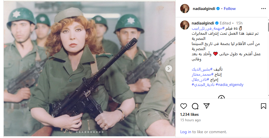 نشرت نادية الجندي عبر حسابها على موقع "انستجرام"، مجموعة من الصور من فيلمها "مهمة في تل أبيب"، وقالت: "تم تنفيذ هذا العمل تحت إشراف المخابرات المصرية، من أحب الأفلام ليا، بصمة في تاريخ السينما المصرية، عمل أفتخر به طول حياتي وأخلد به بعد وفاتي".
