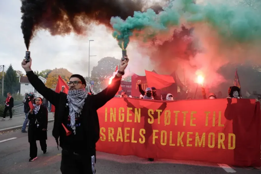 أشعل المتظاهرون المؤيدون للفلسطينيين مشاعل ولوّحوا بالأعلام أثناء توجههم إلى الملعب قبل مباراة تصفيات كأس العالم بين النرويج وإسرائيل يوم السبت.