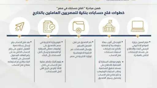 وتتضمن الخطوات خمس مراحل أساسية تبدأ بـ زيارة العميل للموقع الإلكتروني للبنك الأهلي أو بنك مصر للاطلاع على الإرشادات والمتطلبات الخاصة بالمبادرة، ثم التوجه إلى أقرب بعثة دبلوماسية أو قنصلية مصرية بالخارج لاستيفاء نموذج فتح الحساب.