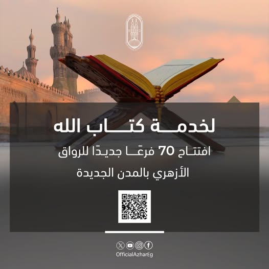 أعلن الجامع الأزهر الشريف، عن افتتاح ٧٠ فرعًا جديدًا للرُّواق الأزهري لتحفيظ القرآن الكريم، وذلك في عدد من المدن الجديدة؛ لتلبية احتياجات الرَّاغبين في حفظ القرآن الكريم وإتقان تلاوته.