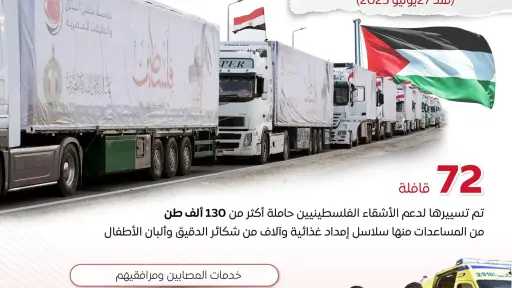 - "زاد العزة من مصر لغزة".. 72 قافلة بحمولة تتجاوز الـ 130 ألف طن مساعدات تؤكد استمرار التضامن المصري مع الأشقاء الفلسطينيين