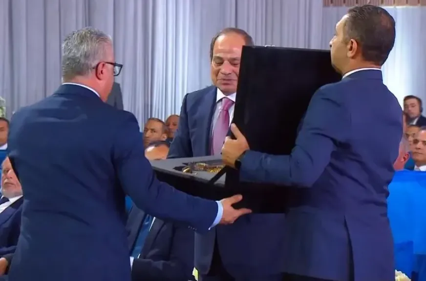 رئيس هيئة المنطقة الاقتصادية يقدم للرئيس السيسي هدية في شكل مجسم لسفينة فرعونية