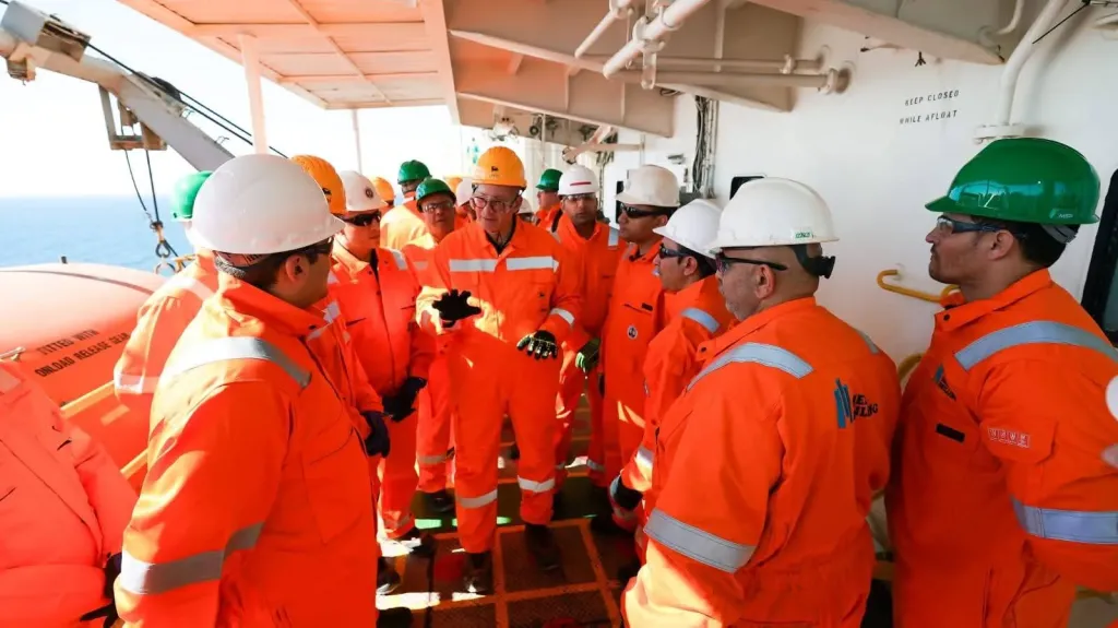 وخلال الجولة، تابع الوزير سير العمل في حفر البئر من على متن الحفار البحري Trident 16 التابع لشركة Shelf Drilling، والذي يعمل حالياً في خليج السويس، حيث يستهدف بئر بلاعيم البحري 133 الوصول إلى عمق يتجاوز 2600 متر.