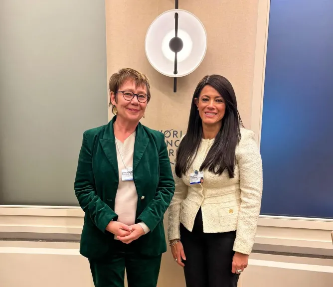 التقت الدكتورة رانيا المشاط، وزيرة التخطيط والتنمية الاقتصادية والتعاون الدولي ومحافظ مصر لدى البنك الأوروبي لإعادة الإعمار والتنمية، السيدة/ أوديل رينو باسو، رئيس البنك الأوروبي لإعادة الإعمار والتنمية EBRD، وذلك خلال فعاليات المنتدى الاقتصادي العالمي "دافوس" 2026.