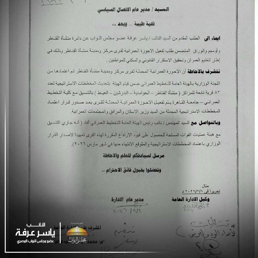 بعد جهود النائب ياسر عرفة.. تفعيل الأحوزة العمرانية لقرى منشأة القناطر لتحسين البيئة العمرانية