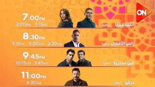 - على قناة ON: الساعة 12:15 صباحاً، و7:45 صباحاً