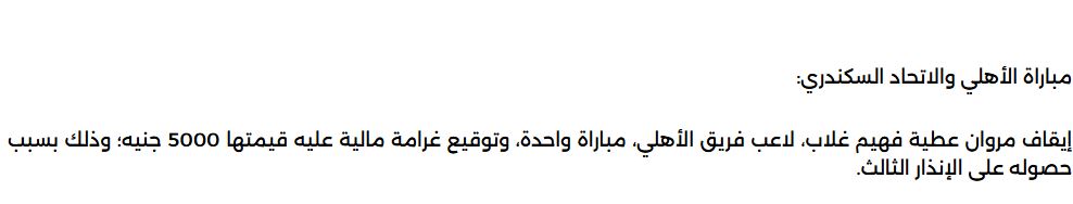 وأعلنت رابطة الأندية المصرية المحترفة عقوبات الجولة الثامنة عشر مساء أمس الأحد، ولم تتضمن اسم مروان عطية بالإيقاف، رغم حصوله على بطاقة صفراء في مباراة الجونة.