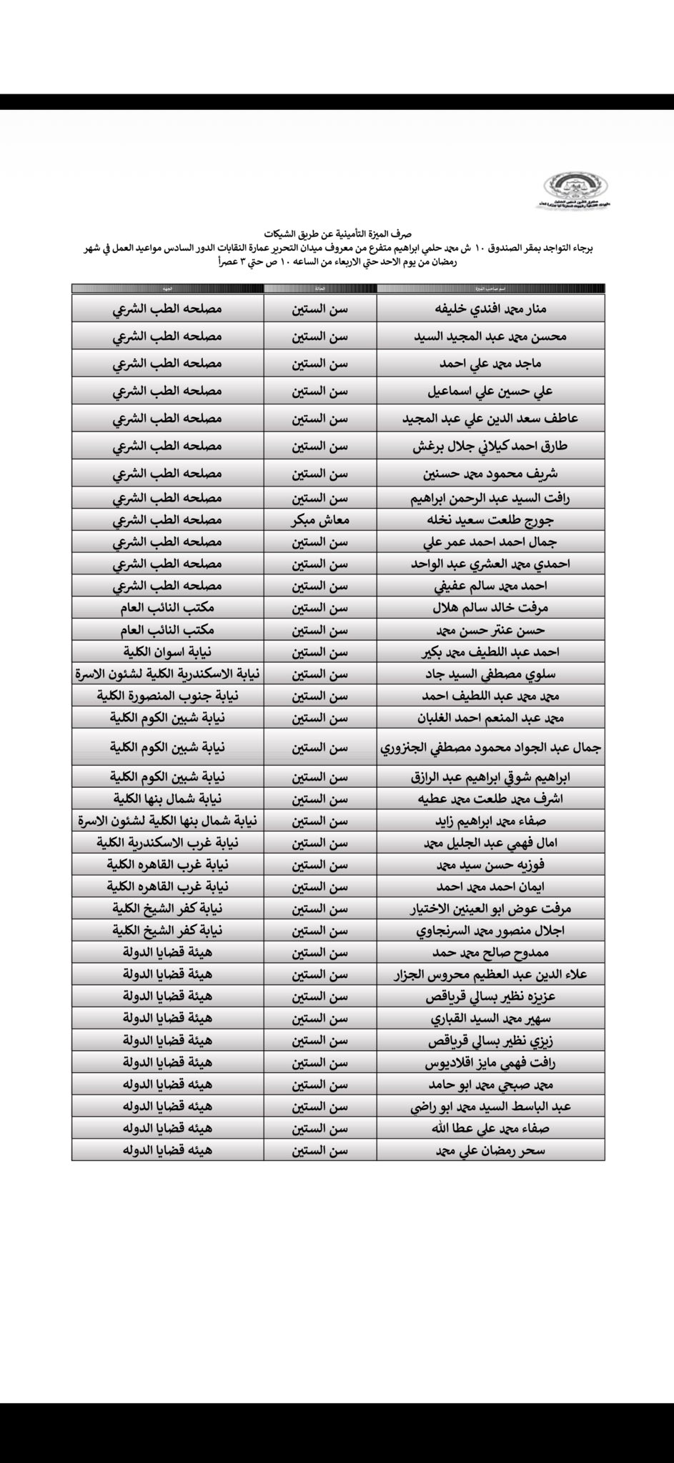 وافق كريم عبدالباقي، رئيس النقابة العامة للعاملين بالنيابات والمحاكم ورئيس مجلس إدارة صندوق التأمين الخاص للعاملين بالهيئات القضائية والجهات المعاونة لها بوزارة العدل، على صرف دفعة جديدة من مستحقات أعضاء الصندوق، بإجمالي 450 حالة من مختلف النيابات والمحاكم والهيئات القضائية، بقيمة إجمالية بلغت 20 مليونًا و470 ألف جنيه.