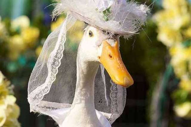 وفى نهاية العرض، استقبل الجمهور بطة متبرجة وأنيقة مرتدية ثوب عروس وأخرى بثوب عريس متألق.